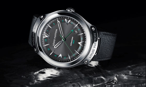 Case : steel, back engraved with the letters LV, water-resistant to 50m Diameter : 41mm Movement : self-winding ETA 2893 (42h power reserve) Functions : hours, minutes, seconds, date, dual-time display Dial : lacquered anthracite with sunburst and circular satin-brushed finishes, green GMT indication, rhodiumed hour-markers, black PVD-coated seconds and GMT hands, rhodiumed hours and minutes hand Strap : black Taurillon leather strap or polished and satin-brushed steel bracelet, double LV folding clasp