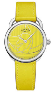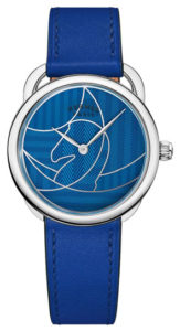 Pünktlich zu ihrem 40. Geburtstag kleidet sich die Arceau d’Hermès mit leuchtenden Farben und bekennt sich lautstark zum Reitsport als Inspirationsquelle. Bei den Modellen der Kollektion Arceau Casaque wird das runde Gehäuse mit asymmetrischen Bandanstössen, deren Form an Steigbügel erinnert, zur Reithalle. Auf ihren Bahnen erkennt man die Umrisse der Figuren aus dem berühmten französischen Brettspiel «Jeu de petits chevaux». Die in Grubenschmelztechnik gefertigten Zifferblätter werden wabenförmig ausgehöhlt und die Vertiefungen anschliessend lackiert. Ein Ton-in-Ton aufgestempeltes Chevronmotiv vollendet ihre minimalistische Ästhetik, die auf die üblichen geneigten arabischen Ziffern verzichtet. Begleitet werden die farbenfrohen Casaques von vollkommen glatten Lederarmbändern.