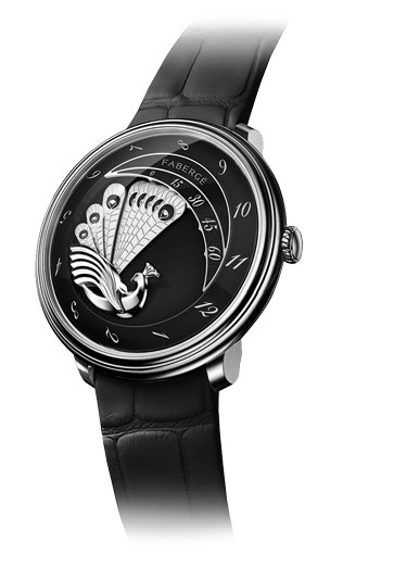 Der Pfau, Gewinner des GPHG 2015 in der Kategorie «Hohe Mechanik für Damen», erscheint dieses Mal in Schwarz-Weiss. Während er sein Rad schlägt, zeigen seine Federn die Minuten an. Die Stunden können auf einer sich drehenden Scheibe gegenüber der Krone abgelesen werden.