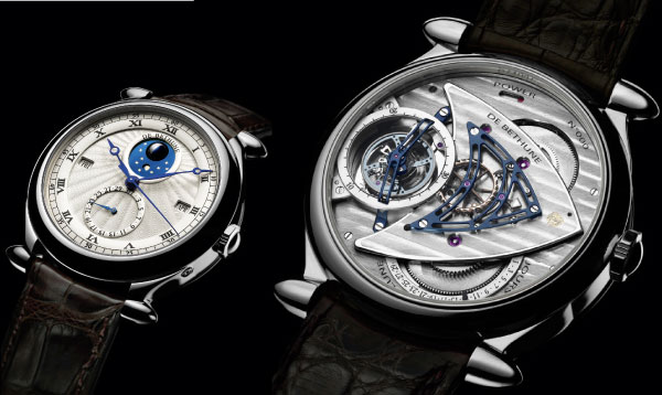 Gute Neuigkeiten für Sammler: Der Tourbillon Régulateur DB16 wird in fünf Exemplaren in Platin aufgelegt. Hinter dem relativ schlichten Design verbirgt sich ein herausragendes Werk mit ewigem Kalender und springender Sekunde, dessen 30-Sekunden-Tourbillon in Silizium und Titan mit 36 000 Halbschwingungen pro Stunde nur durch den Gehäuseboden sichtbar ist. Seine 63 Bestandteile wiegen nur 0,18 Gramm! Nicht zu vergessen, dass dieses Aushängeschild des Könnens des Forschungs- und Entwicklungslabors von De Bethune allein sieben Patente zählt: auf der Vorderseite die berühmte kugelförmige Mondphase und die zentrale springende Sekunde und auf der Rückseite zwei selbstregulierende Federhäuser, eine Unruh in Silizium und Weissgold und Spirale mit flacher Endkurve, ein 30-Sekunden-De-Bethune-Tourbillon in Silizium und Titan mit 36 000 Halbschwingungen pro Stunde, ein Hemmungsrad in Silizium sowie eine retrograde Anzeige des Mondalters. Expertenaugen erkennen sofort die berühmten spitzbogenförmigen Bandanstösse von De Bethune sowie die geschwungenen, handpolierten und flammengebläuten Stahlzeiger. Die grösste der kleinen Manufakturen beweist, dass sie auch kontrolliert zu wachsen weiss.