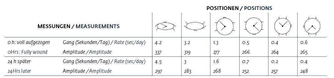 Die beiliegende Tabelle bescheinigt die einwandfreie Ganggenauigkeit des Kalibers 324. Dank der Schwungmasse in 21 Karat Gold ist der einseitig drehbare Automatikaufzug effizient. Die (in dieser Rubrik bereits ausführlich analysierten) Spiromax-Spirale und Gyromax-Unruh arbeiten wirksam zusammen, um das Werk auf eine Frequenz von 4 Hz zu bringen. Die gemessenen Werte der vom Hersteller mit 35 bis 45 Stunden angegebenen Gangreserve lagen an der oberen Grenze dieser überraschend breiten Spanne. Nichtsdestotrotz ist diese geringe Gangautonomie mit Sicherheit die grösste Schwachstelle für eine Fliegeruhr, vor allem, wenn man sie mit den aktuellen Standards vergleicht.