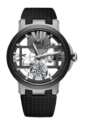 For the EXECUTIVE SKELETON TOURBILLON, ULYSSE NARDIN takes the featherweight approach with a titanium and ceramic case that is ultra-light despite its 45mm diameter, along with a super-airy movement. A raised rectangular bridge accentuates the model’s membership of a collection distinguished by oversized numerals and hour-markers.