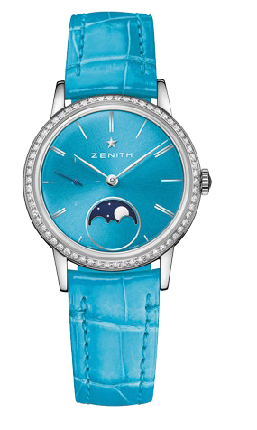 This creation with its turquoise lacquered dial features leaf-type hour and minute hands, small seconds at 9 o’clock, along with a moon-phase complication at 6 o’clock composed of a star-studded midnight blue disk.