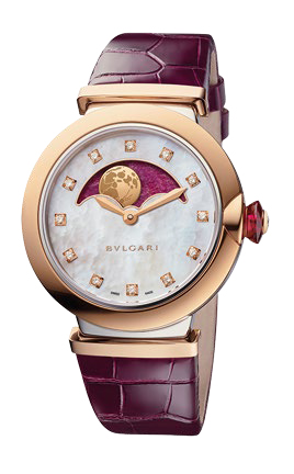 Directly connected to the barrel, this extremely precise moon-phase complication immediately draws the gaze to the appealing motherof- pearl and aventurine dial center that lends a supremely elegant touch to this watch displaying the hours and minutes.
