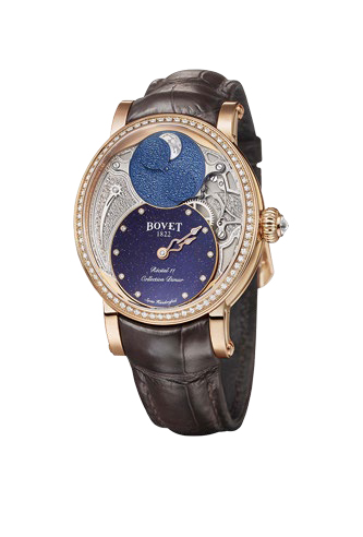 Playing on the day/night contrast, this timepiece displays the moon phases through an aperture shaped like the arc of a circle and appearing in the upper part of the dial that is swept over by hours and minutes hands.