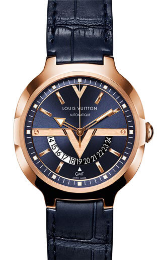 Contemporary, modern, masculine and urban are the design adjectives Louis Vuitton uses most frequently to describe this brand-new Voyager collection, which stands out immediately by its appealing and distinctively hybrid case shape. The elegant nomadic spirit of Louis Vuitton is embodied in the contrasting lines and the GMT function. Clearly visible and yet smoothly integrated within the dial, the central V points towards the dual-time display, itself easily readable through the semi-circular 24-hour aperture complete with day/night indication. The LV signature on the oscillating weight of the self-winding movement can also be admired through the sapphire crystal back of the case, available in steel and pink gold, and even platinum for the flying tourbillon version bearing the Poinçon de Genève quality hallmark. The collection already comprises six variations. The personality of the Voyager evolves in step with dial colors and the components of the steel bracelet or the strap in Louis Vuitton’s famous Taurillon leather. Travel has never been so pleasant…