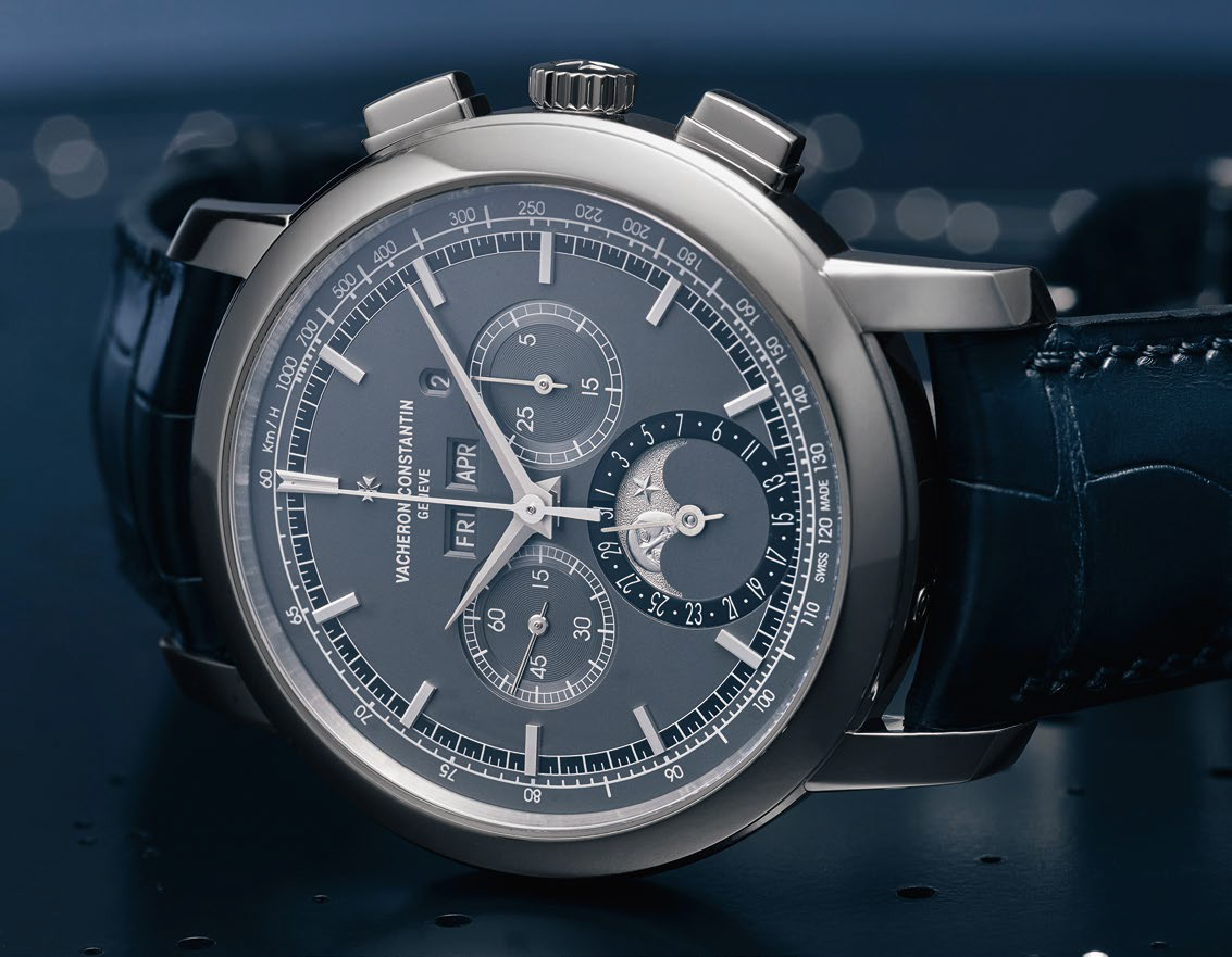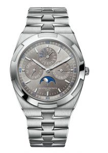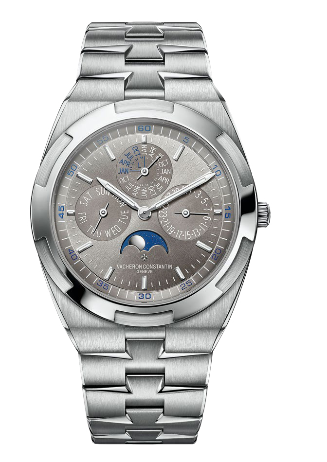 Equipped with a highprecision gear train, the moon-phase mechanism – also referred to as an “astronomical moon” – requires just one correction every 122 years. In a sportier vein corresponding to the needs of inveterate travelers, Vacheron Constantin brings the complexity of astronomy to the heart of the Overseas ultra-thin perpetual calendar. This Hallmark of Geneva certified timepiece, available exclusively in Vacheron Constantin Boutiques, houses the iconic Vacheron Constantin Caliber 1120 QP, an ultra-thin mechanical self-winding movement featuring a perpetual calendar with a moon-phase display. This function calls for impressive feats of miniaturization in order to cope with the irregular nature of the calendar with no need for correction until 2100, and accommodating its 276 components within a space barely 4.05mm thick. This technical performance is equaled only by the dynamic elegance of the 41.5mm case in 18K white gold, framing a gray dial punctuated by subtle blue accents.