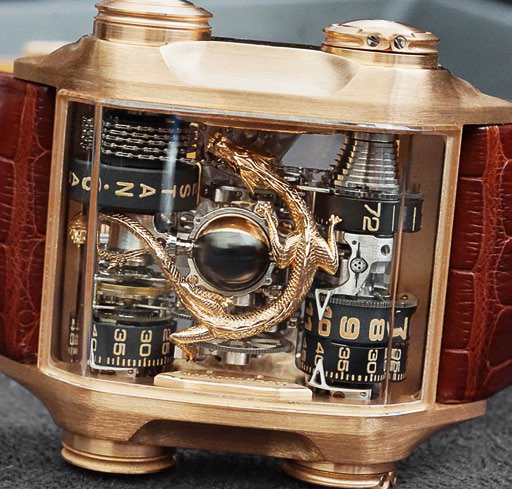Sur la DRAGON NERA de CABESTAN, c’est sans doute le plus petit dragon entièrement sculpté en or du monde qui protège la lune tridimensionnelle et les 942 composants de l’un des mouvements les plus complexes de la planète.
