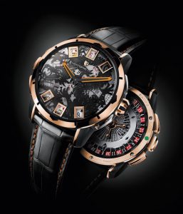 CHRISTOPHE CLARET permet de jouer avec le feu, mais aussi aux dés, à la roulette et au baccarat, sur cette série limitée automatique en or et titane BACCARA DRAGON.