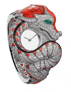 CARTIER marie haute horlogerie et haute joaillerie avec sa MONTRE DRAGON MYSTÉRIEUX entièrement sertie enveloppant son coeur mécanique.